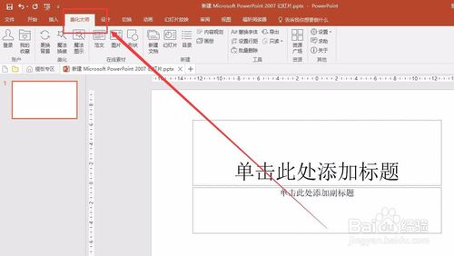 正常情況下如果我們安裝了美化大師,直接打開PPT在工具欄就可以看到美化大師。直接使用即可。