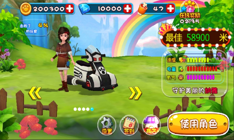 《熊出沒奇幻空間》是根據(jù)動(dòng)畫片《熊出沒》制作的一款橫版賽車游戲。玩家在游戲中可以選擇不同屬性的角色進(jìn)行挑戰(zhàn),游戲?yàn)闊o盡模式,每次開始游戲前會(huì)顯示關(guān)卡需要完成的不同任務(wù)。世界三大盜受 “收藏家”之令前往狗熊嶺盜取金鹿角。熊大熊二光頭強(qiáng)考古機(jī)器人和金鹿角守護(hù)者:鹿族女孩協(xié)力保護(hù)金鹿角。金鹿角被搶走后森林陷入災(zāi)難,強(qiáng)哥吹響號角,被喚醒的金鹿角幻化金色神鹿擊垮反派,森林復(fù)蘇。