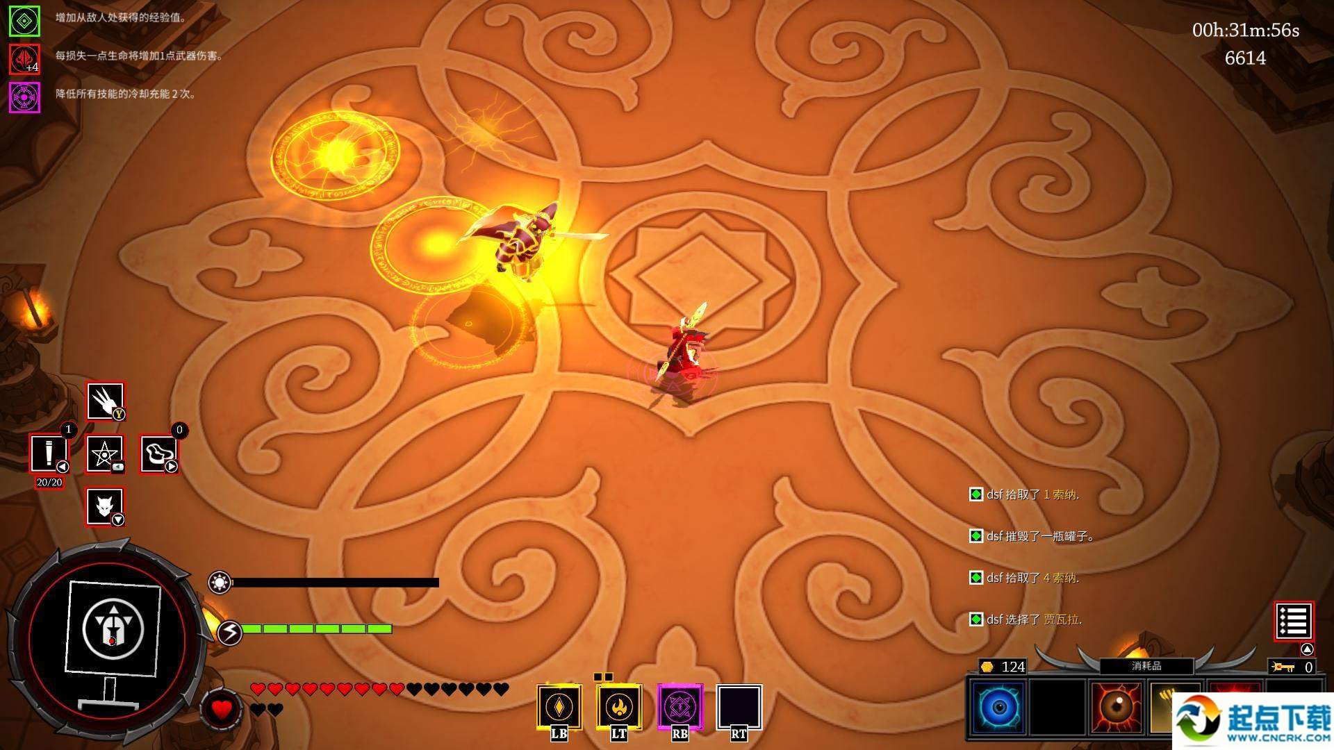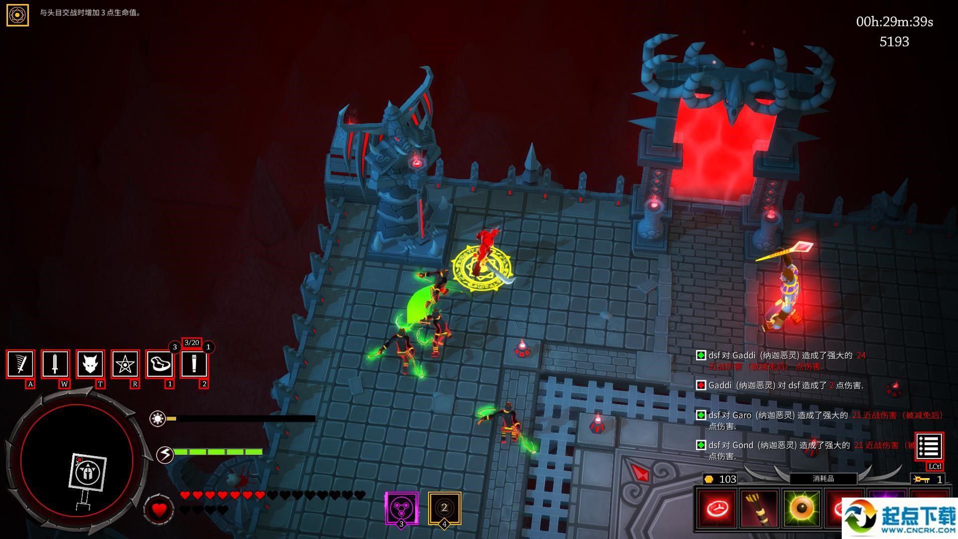 要點注意:boss召喚的小兵這次移速非???,也很脆,被擊中以后會損失耐力值,這是非常致命的,意味著你將喪失行動力,所以千萬別被近身。這次的boss非常懼怕近戰(zhàn)攻擊,在其技能真空期近身造成傷害(期間筆者爆出了一把非常好的近戰(zhàn)武器,砍一刀30血,非常爽)第五關(guān)