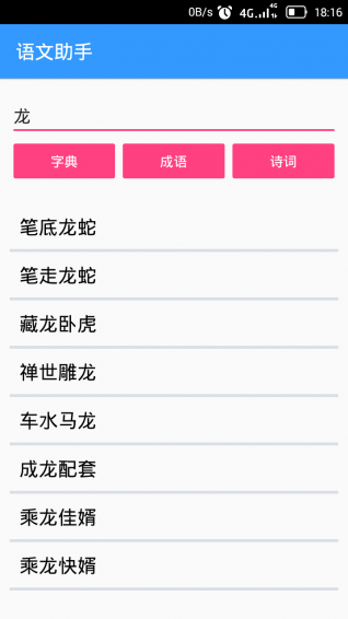 支持查詢生字、成語(yǔ)和詩(shī)詞。成語(yǔ)和詩(shī)詞支持詳細(xì)查詢和模糊查詢。例如,輸入龍字,點(diǎn)擊詩(shī)詞按鈕,下面會(huì)列出所有內(nèi)容中包含靜字的詩(shī)詞。
