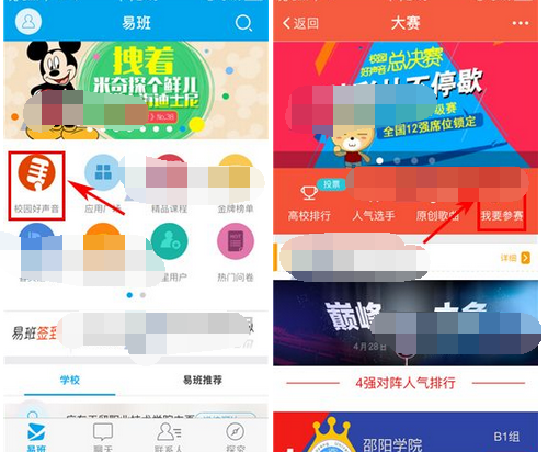1)打開易班,點擊校園好聲音】,接著點擊【我要參賽】;(如下圖)