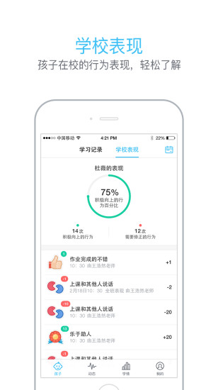 1.孩子表現(xiàn):查看孩子的學(xué)習(xí)記錄以及老師對孩子在校表現(xiàn)的評價,關(guān)注孩子成長的全面成長;2.班群動態(tài):及時接收老師發(fā)布的孩子班級內(nèi)的動態(tài),還可跟老師家長互動,不錯過孩子在校期間的新鮮事兒;