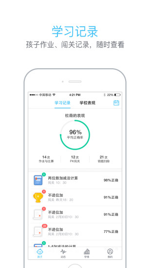 速算盒子家長端是“速算”煉成神器速算盒子新增的家長端應(yīng)用。在這里可以查看孩子的學(xué)習(xí)記錄以及學(xué)情分析,還可以查看老師對孩子在學(xué)校期間表現(xiàn)的評價,跟老師和家長關(guān)于班級內(nèi)的新鮮事進行互動,讓您隨時關(guān)注孩子的教育和成長。【軟件特色】
