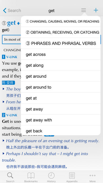另外,還可以將詞組以及例句放入書(shū)簽中,因?yàn)樵跉v史記錄中也備有顯示和搜索功能,所以可以更具體準(zhǔn)確地記錄所查找的內(nèi)容。書(shū)簽沒(méi)有數(shù)量限制,歷史記錄可以放入 500 個(gè)詞條,還可以個(gè)別刪除以及按順序排列書(shū)簽。