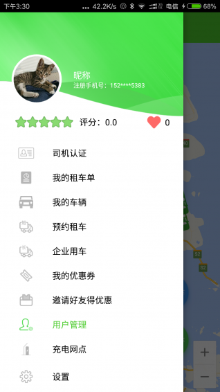 租車:司機在地圖上選擇自己所需車輛進行分時租賃,系統(tǒng)安裝司機租賃的時間進行費用計算