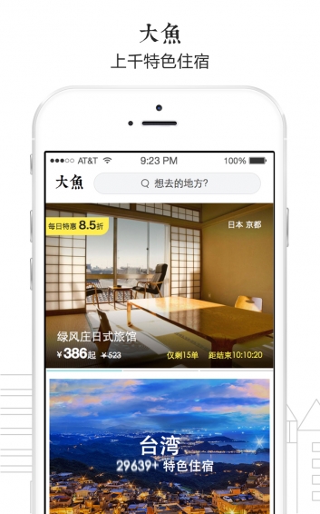 大魚旅行,從住宿開始體驗世界。大魚旅行是國內(nèi)領(lǐng)先的海外民宿線上預(yù)訂平臺,現(xiàn)已開通臺灣、泰國、日本、韓國,提供上萬家海外特色住宿預(yù)訂服務(wù)。大魚致力于打造出境游預(yù)訂民宿、客棧、青旅和精品酒店的最佳平臺,專業(yè)旅行顧問提供全程咨詢服務(wù)。加入大魚股東計劃,向朋友分享心儀的民宿、客棧、青旅和精品酒店,獲取豐厚分紅。
