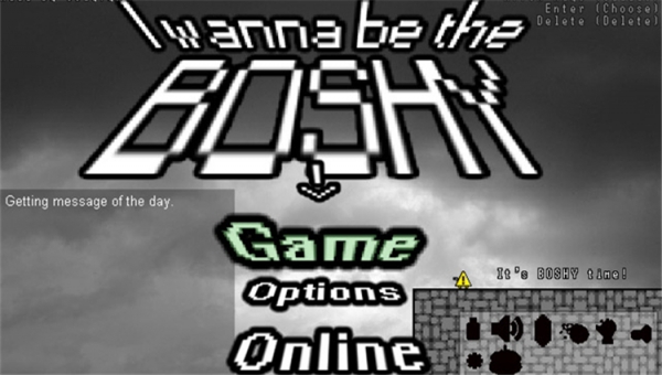 《i wanna be the boshy》進(jìn)入游戲的默認(rèn)角色是一個(gè)黃色的警示牌,如果不喜歡,可以按F3更換角色。開始游戲的時(shí)候,小編建議大家把鼠標(biāo)給扔出去,不然在游戲里會成為一個(gè)恐怖的障礙。這個(gè)游戲里的Save存檔變成了一個(gè)笑臉,當(dāng)我們開槍射擊的時(shí)候,笑臉會生氣,然后吐出子彈消滅我們。而且射擊的瞬間,角色在哪,存檔點(diǎn)就設(shè)定在哪。在游戲中我們可以多多利用這一設(shè)定。