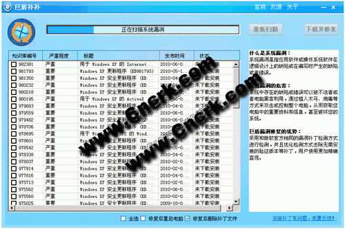 巨盾補(bǔ)補(bǔ):是一款針對(duì)個(gè)人用戶而設(shè)計(jì)的綠色漏洞補(bǔ)丁軟件,集綠色、小巧、全面、精確于一身,是您升級(jí)系統(tǒng)漏洞的不二選擇。