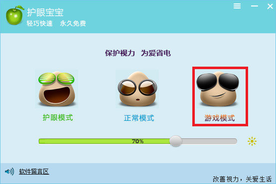 護眼寶寶是天翼工作室推出的一款輕巧快速、簡單易用且永久免費的屏幕亮度調(diào)節(jié)軟件。支持電腦保護色的設(shè)置,色彩調(diào)節(jié)后,重新載入軟件整體進度條也會改變,支持設(shè)置快捷方式,更方便的調(diào)節(jié)屏幕亮度,既可以通過模式選擇(護眼模式、正常模式、游戲模式),也可以通過滾動條自己調(diào)節(jié)屏幕亮度,非常方便.【軟件特色】