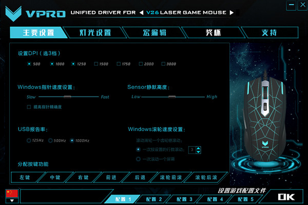雷柏V26專屬驅(qū)動設(shè)置,“主要設(shè)置”頁面選擇DPI以及USB報告率,針對鼠標的7個按鍵進行自定義?!盁艄庠O(shè)置”頁面可以選擇背光模式,1600萬色智能呼吸燈由你選擇?!昂昃庉嫛笨梢酝ㄟ^特殊的自定義編寫,將一系列動作簡便化。全新雷柏驅(qū)動UI加入“獎杯”頁面,統(tǒng)計玩家使用按鍵的次數(shù),更直觀更有趣的了解鼠標的戰(zhàn)斗狀態(tài)。
