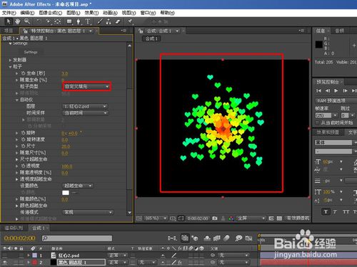 再來點(diǎn)擊下個(gè)類型-自定義,你會(huì)發(fā)現(xiàn)什么也沒有,沒關(guān)系,下面還要調(diào)整設(shè)置,我們先調(diào)入任意圖片或者形狀,然后在自動(dòng)儀(估計(jì)是翻譯錯(cuò)誤應(yīng)該是自定義),圖層選擇我們導(dǎo)入的圖片或者形狀,你會(huì)看到粒子會(huì)根據(jù)我們導(dǎo)入的圖片或者形狀發(fā)射,如下圖:
