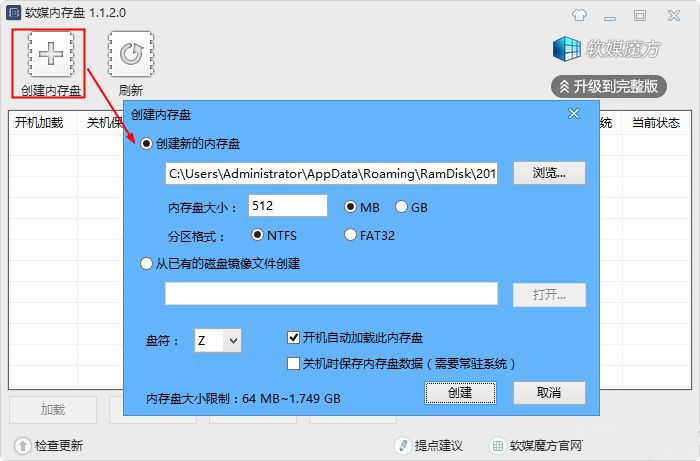 軟媒內(nèi)存盤使用相當(dāng)簡(jiǎn)單,內(nèi)部操作也均是全中文界面,我們主要是創(chuàng)建一個(gè)內(nèi)存緩存盤。方法是點(diǎn)擊軟媒內(nèi)存盤軟件左上角的新建按鈕,創(chuàng)建一個(gè)新的內(nèi)存盤,內(nèi)存大家自己設(shè)置,按三分之一或四分之一內(nèi)存大小設(shè)置較為合適,超過4G的,建議新建1G以上的閃存盤,這樣提速會(huì)更明顯。另外當(dāng)我們不想用的時(shí)候,我們還可以點(diǎn)擊下方的移除卸載,這樣就可以輕松卸載掉,恢復(fù)閑置內(nèi)存了