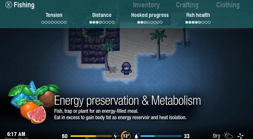 你的每一步行動(dòng)和每一個(gè)動(dòng)作都將會(huì)消耗能量,你只能通過攝取食物補(bǔ)充。如果你耗盡精力,你的運(yùn)氣就用完了。設(shè)置陷阱捕捉野生動(dòng)物,新鮮的魚或收獲