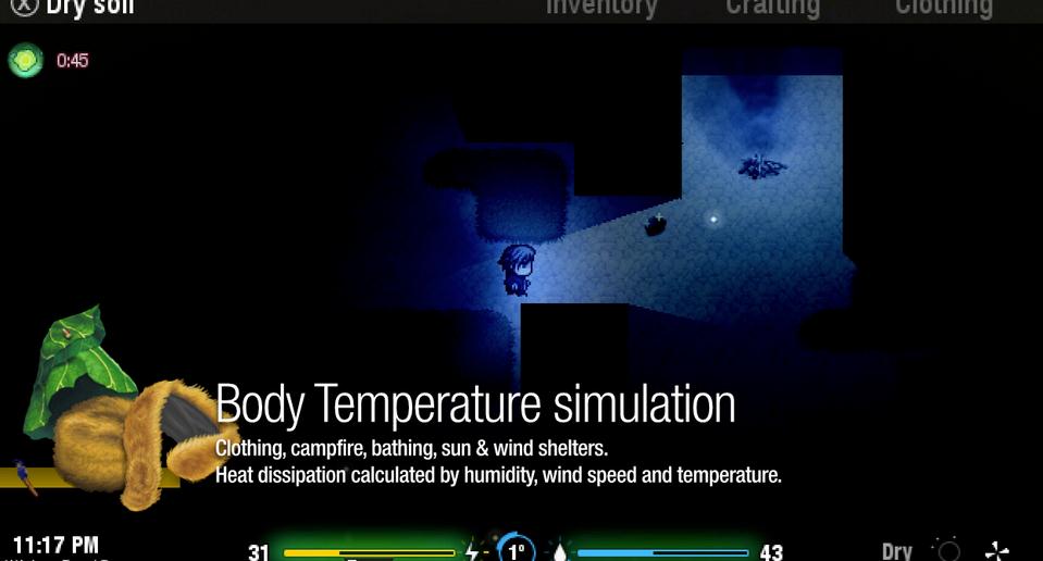 燃燒燃料,根據(jù)燃料數(shù)量,風(fēng)速和濕度,火增加小洞穴的環(huán)境溫度。火和取暖行為要根據(jù)現(xiàn)實(shí)生活的行為做出清醒的選擇。