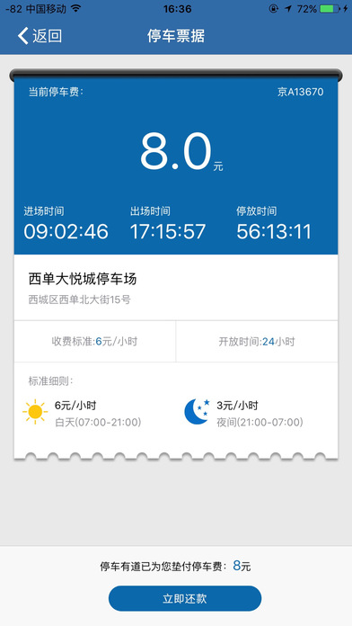 (3)停車:只要綁定了車牌號,進場自動生成停車票據(jù),輕松掌握停車時間和費用等信息,讓停車計時更明晰。