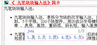 九筆塊塊輸入法,是拆分為塊的漢字輸入法,只有160個(gè)單字有重碼。九筆塊塊輸入法使用九種筆劃、7個(gè)字根,200個(gè)塊部件,用25或26字母鍵編碼,與傳統(tǒng)五筆、鄭碼、二筆輸入法相比,具有簡(jiǎn)單 、易用、高效、重碼低、碼長(zhǎng)短,輸入速度快,可以高效輸入漢字,詞組和句子。