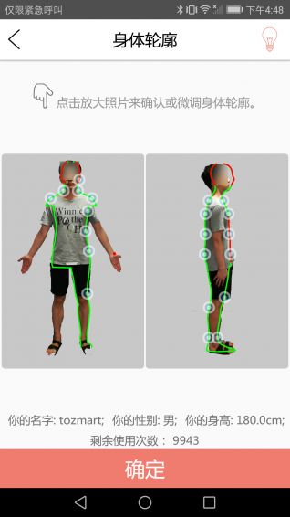 易量體APP讓用戶通過拍攝正側面兩張照片測量多個人體尺寸。用戶使用APP時,只需透過三個簡便步驟:拍照,確認身體輪廓,即可把測量結果交互地展示于用戶的個性化三維模型。用戶可以保存測量記錄。與此同時,根據(jù)不同國家的尺碼標準,智量體APP為用戶提供各國尺碼建議。其他功能包括體型分析、量體尺寸圖表分析,可幫助健身用戶追蹤個人的身體尺寸的變化。用戶亦可用智量體APP為親友量體獲取尺碼選擇,讓線上購物為親友購買衣服變得輕松又自在。【軟件特色】