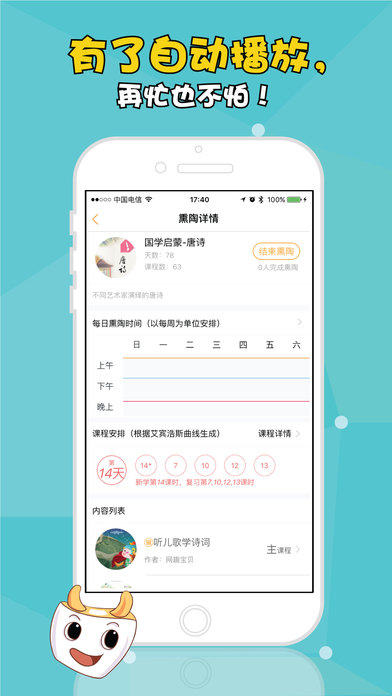 關(guān)注兒童內(nèi)在成長的教育軟件,擁有海量精選資源,國學、故事、音樂、英語等,在線時刻更新。資源經(jīng)過兒童心理學專家篩選、編碼,更貼合孩子成長需要。牛聽聽APP是一款專注于兒童內(nèi)在成長的教育軟件,配套牛聽聽兒童智能熏教機使用。這款軟件專為孩子的熏聽啟蒙教育而設計。熏聽啟蒙,通過把握孩子成長的關(guān)鍵期,讓孩子每天在自由玩耍中重復聽優(yōu)質(zhì)的聲音資源:如國學經(jīng)典、英語童謠、繪本童話、經(jīng)典古樂等等,以此達到學養(yǎng)熏陶的效果。APP內(nèi)含有海量優(yōu)質(zhì)音頻資源,經(jīng)過了權(quán)威兒童心理學專家篩選、編碼,使各類音頻更符合孩子的成長需要。