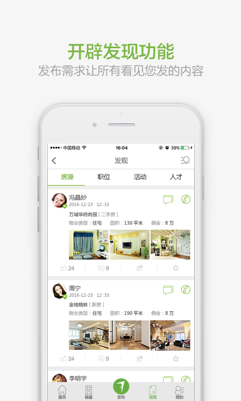 經(jīng)紀(jì)人可發(fā)布樓盤、房源、找房、招聘、求職、活動(dòng)等信息;