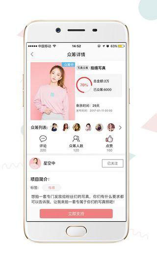 星主頁(yè)APP是深圳開(kāi)拍網(wǎng)運(yùn)營(yíng)的影視內(nèi)容孵化和藝人成長(zhǎng)平臺(tái)。開(kāi)拍網(wǎng)是影視眾籌舞臺(tái),已成功打造眾多新藝人和優(yōu)質(zhì)影片,覆蓋寫真|網(wǎng)絡(luò)大電影|網(wǎng)劇|綜藝|電視劇|院線電影,眾籌成功率高,且全部盈利。如何出品優(yōu)質(zhì)內(nèi)容?開(kāi)拍網(wǎng)將傳統(tǒng)影視全程互聯(lián)網(wǎng)化,用戶通過(guò)眾籌、IP/演員競(jìng)選、轉(zhuǎn)發(fā)收益、權(quán)益轉(zhuǎn)讓,深度參與內(nèi)容出品,層層選擇確保優(yōu)質(zhì)內(nèi)容的產(chǎn)出。用戶不但有機(jī)會(huì)參與票房分紅,還能獲得明星見(jiàn)面會(huì)、簽名照、劇組探班、群演客串、電影票|演出票、周邊等。