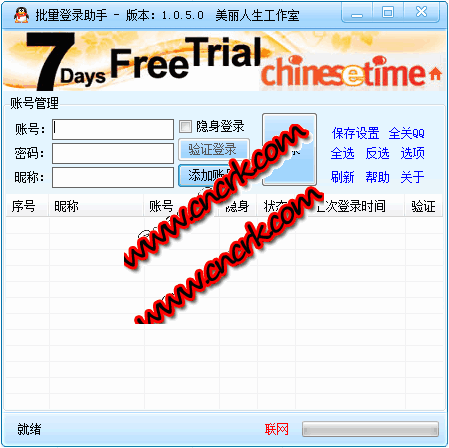 使用前必須驗證所有QQ號是否能正常登錄!驗證完成才能實現后臺登錄!具體辦法是,先關閉所有QQ,點驗證登錄,等正確登錄完成,一定先關掉QQ然后再點是,密碼錯誤請點否,停止驗證請點取消,直至所有QQ完成驗證,過程中最好不要干任何事。密碼不對請修改好再重新驗證!本版本為測試版!內部測試用!強烈建議先退出所有QQ再退出本軟件。要不有安全問題。