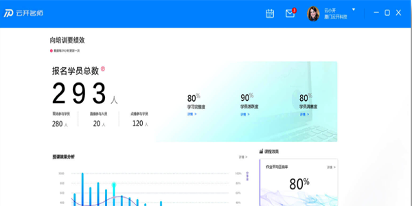 云開平臺(tái)擁有最完整的學(xué)習(xí)數(shù)據(jù)統(tǒng)計(jì),包括課程完成度、課程效果、學(xué)生行為、老師行為等所有內(nèi)容的記錄的統(tǒng)計(jì)分析,為學(xué)生的學(xué)習(xí)效果、學(xué)習(xí)建議、老師的課程優(yōu)化提供數(shù)據(jù)支撐,在不需要增加任何工作內(nèi)容的情況下,老師和學(xué)生可以高效便捷的一鍵查詢。