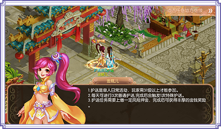 玩家等級達到31級后即可解鎖護送任務(wù),護送任務(wù)是單人任務(wù),接取任務(wù)需要抵押一定的銀幣,護送NPC到達指定地點后即可獲得豐厚的銀幣獎勵。玩家每天可以完成3次普通護送任務(wù),完成第3次護送任務(wù)后有概率觸發(fā)額外護送任務(wù),平均每次護送任務(wù)能夠賺取十幾萬銀幣。