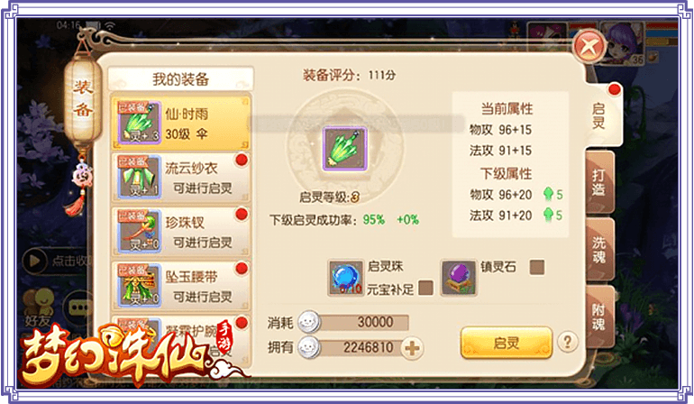 《夢幻誅仙》手游中的角色,可以通過穿戴裝備來提升自身各項能力。裝備自身存在品質(zhì)上的差異,品質(zhì)越高基礎(chǔ)屬性越好,除此之外,還可以對裝備進行養(yǎng)成,讓裝備更強力。裝備養(yǎng)成玩法包括啟靈、洗魂和附魂,啟靈讓裝備基礎(chǔ)屬性得到強化,洗魂可洗煉更適合的屬性和更高的屬性數(shù)值,附魂就是把舊裝備的收益轉(zhuǎn)移到新裝備上,轉(zhuǎn)移過程存在風險。