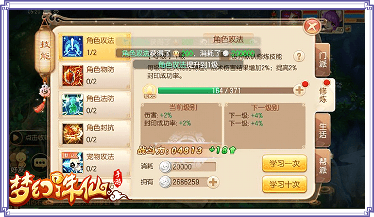 《夢幻誅仙》手游中,角色修煉是一個獨立的可強化角色戰(zhàn)力的系統(tǒng)。在修煉中,可針對性強化角色的能力,如攻擊、物理防御、法術(shù)防御等,修煉中除了針對角色的,還有針對寵物和伴侶的修煉,只不過寵物修煉和伴侶修煉,并不能直接提升角色戰(zhàn)斗力評價。