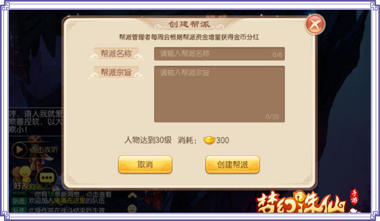 幫派是游戲中基礎(chǔ)的社交玩法之一,玩家達到一定等級即可加入幫派,打開幫派頁面尋找合適的幫派申請加入即可;也可以選擇創(chuàng)建幫派,等級達到30級后,只需輸入幫派名稱和幫派宗旨,消耗一定元寶即可創(chuàng)建幫派。加入幫派后還能參加幫派活動,每天中午13:00參與幫派強盜活動,每周2/4/6晚上20:00參與幻月洞府活動,幫派與幫派之間還能開展幫派競賽。