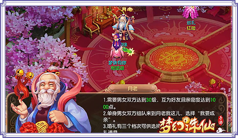 當男女雙方達到30級時,組隊來到月老(京城276,56)處,選擇“我要成親”,婚禮有三個檔次可以選擇,不同檔次的婚禮扣除隊長不同數(shù)量的銀幣或婚禮道具。結(jié)婚后,夫妻雙方組隊還有經(jīng)驗加成和夫妻技能哦。需要注意的是,男女雙方成婚前必須互為好友且親密度達到1000點。成婚后還可在紅娘出進行花車巡禮,受到全京城的矚目哦。