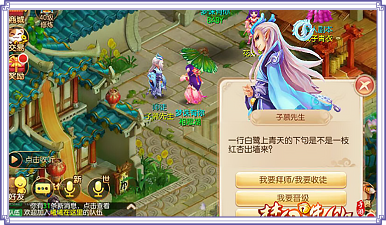 當玩家等級達到25級以后,方可拜師。與師父組隊前往子慕先生(京城224,217)處發(fā)起申請即可。其中師父等級必須大于徒弟且徒弟數(shù)量未滿,雙方互為好友且親密度達到50以上,24小時之內(nèi)沒有解除過師徒關(guān)系才可以,需要注意的是,組隊發(fā)起申請時必須師父為隊長。老司機們趕緊去收一枚萌萌的徒弟弟吧。