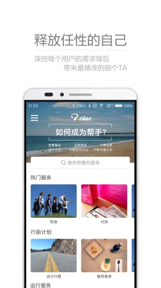 通過連接你和「Relax」上遍布世界各地的華人服務(wù)者,我們能幫助他們不管選擇生活在世界上哪一個角落,都能建立并發(fā)展自己的事業(yè),通過服務(wù)自己的同胞來獲得一份穩(wěn)定的收入。