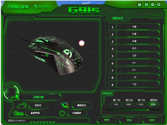 1、驅(qū)動(dòng)界面包含燈光設(shè)定、按鍵設(shè)定、高級(jí)功能、DPI設(shè)定四個(gè)部分。2、燈光設(shè) 定是對(duì)Logo和Nine燈光進(jìn)行設(shè)定。