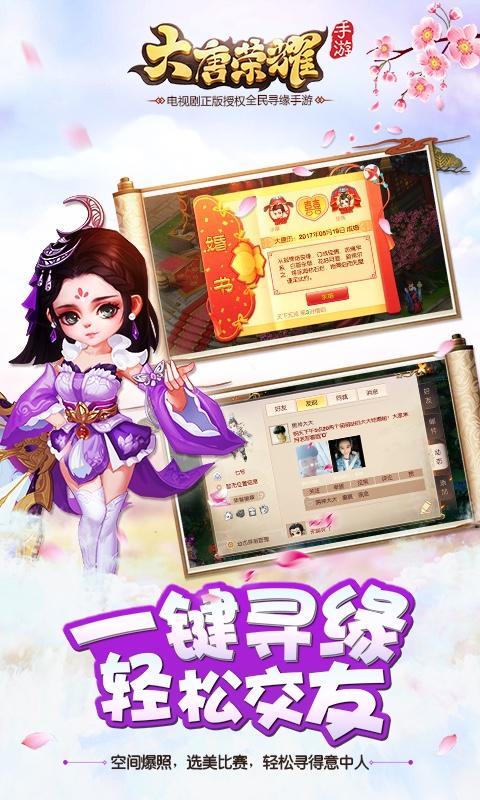 《大唐榮耀》電視劇正版授權(quán)手游,精心還原電視劇情和場景道具,更有超多隱藏情節(jié)等待挖掘,體驗精彩的大唐世界。作為一款尋緣的Q版回合手游,《大唐榮耀》搭配LBS真實定位系統(tǒng),與咫尺的ta浪漫相約。創(chuàng)新戰(zhàn)斗示愛功能,對心儀之人熱情告白,攜手私奔。游戲還為玩家準備了唯美的盛唐婚禮,情侶坐騎、互動動作、情侶時裝、情侶家園等等。讓世界見證你們的愛。2017甜蜜尋緣回合手游,《大唐榮耀》等你來尋緣!【游戲特色】