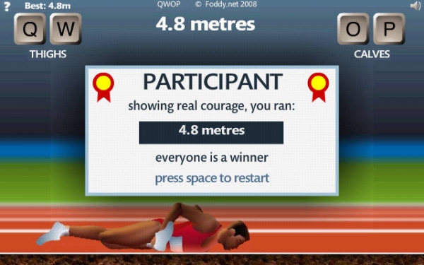 qwop百米賽跑是一款非常虐心的賽跑游戲,這款游戲曾十分火爆,超高的難度讓不少玩家有想砸機(jī)子的沖動(dòng)。游戲的玩法十分簡(jiǎn)單,就是讓你跑完100米。但是,幾乎沒(méi)有人可以跑完全程。。。玩本游戲要考慮物理因素,例如要想前進(jìn)的話,首先要保證重心向前傾,然后再交替運(yùn)用雙腿。另外由于物理因素的存在,操作雙腿不能僅僅尊從按鍵說(shuō)明字面上的意思,動(dòng)左腿的話,通常右腿也會(huì)受到牽引,這些都需要自己思考和嘗試。