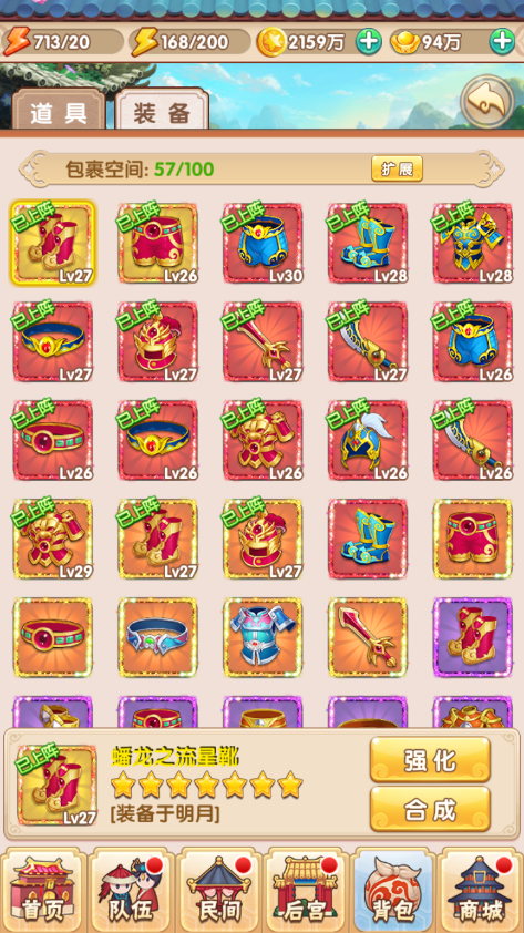 《還珠格格》共有白、綠、藍(lán)、紫、橙、紅、金,共7種顏色的裝備,對應(yīng)不同的品級資質(zhì)和星數(shù),金色7星裝備為最高品級。而裝備又分為武器、頭飾、戰(zhàn)袍、項(xiàng)鏈、護(hù)腿、戰(zhàn)靴6種,每個部位對應(yīng)不同的屬性和特效。