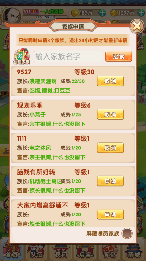 首先,在游戲主界面點(diǎn)擊“家族”,然后選擇加入一個家族或自己創(chuàng)建一個家族。加入家族時,可在申請列表里點(diǎn)擊申請或加入,家族旁邊的按鈕是“加入”,說明這個家族開啟了免審核模式,你可以自由加入。如果家族旁邊的按鈕是“申請”,你需要耐心等待族長通過你的申請。一個玩家最多可以同時申請3個家族。退出家族后要24小時才能重新再申請加入啦,一定要謹(jǐn)慎!