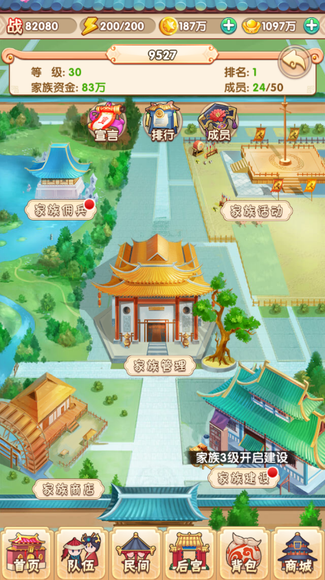 7.家族加入:到達(dá)一定等級之后,家族系統(tǒng)可以開啟,記住一定要加入哦,并且要每天增加自己在家族中的活躍度,不然會被踢掉的?。剀疤崾荆好刻熳疃嘀豢梢陨暾埲渭尤耄坏痪芙^,就得等到第二天才可以申請了)