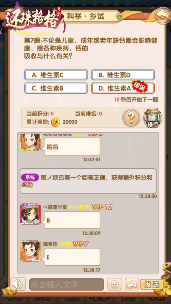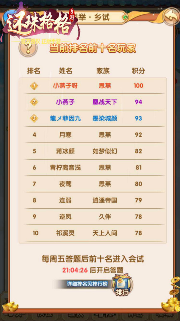 每日鄉(xiāng)試結(jié)束之后都會公布累積積分前十名的玩家排名,直到周五答題結(jié)束之后排名前十名的玩家將參與到周六的會試。所以一次考試失利并無大礙,只需在下一場鄉(xiāng)試中調(diào)整心態(tài)迎頭趕上即可。