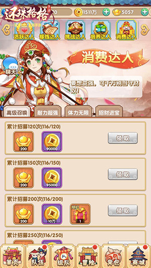 在《還珠格格》消費(fèi)成就中,共有四個小成就供玩家解鎖,分別是需要玩家累積招募次數(shù)的高級召喚成就、累積耐力丹使用次數(shù)的耐力超強(qiáng)成就、累積體力丹使用次數(shù)的體力無限成就和累積招財(cái)樹招財(cái)次數(shù)的招財(cái)進(jìn)寶成就。其中最吸引玩家的想必是召喚成就,橙色人物隨機(jī)送,每個人物都能夠助玩家一臂之力。