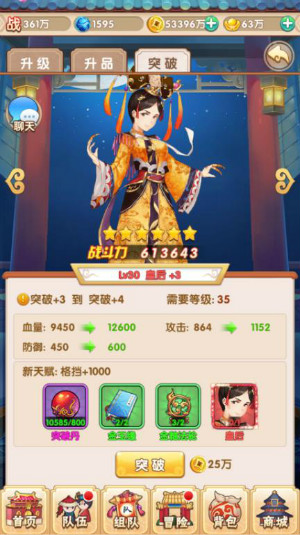 其次升到一定等級之時便能對人物進(jìn)行突破,突破所需的突破丹可以用元神在坊市中購買,也可以在會賓樓中用忠勇令進(jìn)行兌。人物突破之后將獲得新天賦,戰(zhàn)力也將大幅提升,如果你的隊(duì)伍里有一個+8的神品人物助陣必定會讓對方感到恐懼。