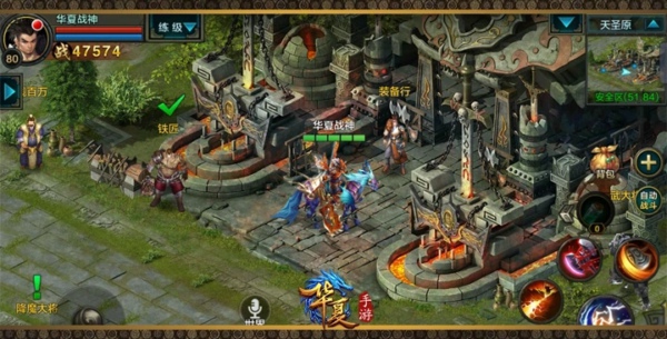 《華夏》手游的logo沿用了端游的美術(shù)風(fēng)格,厚重質(zhì)樸的配色突出了“華夏”兩個(gè)字。一進(jìn)入角色選擇界面,入耳的便是悠揚(yáng)舒緩的背景音樂(lè)(如果是老玩家,能聽(tīng)出是沿用了北郡地圖的BGM),親切感倍增。每個(gè)賬號(hào)下最多可以創(chuàng)建3個(gè)角色,有戰(zhàn)士、法師、暗巫、幻師4個(gè)職業(yè)、2種性別可供選擇,每種職業(yè)可以預(yù)覽到2個(gè)可選擇的職業(yè)成長(zhǎng)形態(tài)。在職業(yè)選擇界面,能看出四大職業(yè)角色外觀與端游8D裝備外觀相比還原度較高,但角色的美術(shù)效果更加細(xì)膩、生動(dòng),不僅能清楚地看到武器細(xì)節(jié),還能看到人物的面部輪廓,相當(dāng)細(xì)致。游戲的整體畫面風(fēng)格較為質(zhì)樸、復(fù)古,選用了低飽和度、低明度的配色,不會(huì)帶來(lái)過(guò)于強(qiáng)烈刺激的視疲勞效果。游戲畫面的視野較為開(kāi)闊,同屏最大顯示玩家數(shù)量可達(dá)到30人,能滿足多人同屏戰(zhàn)斗的需要。游戲畫質(zhì)較為細(xì)膩,建筑、草地、樹(shù)木、NPC的畫面細(xì)節(jié)表現(xiàn)都比較到位,人物、場(chǎng)景在沿用原端游美術(shù)風(fēng)格的基礎(chǔ)上同比例放大,表現(xiàn)更為真實(shí)、注重細(xì)節(jié)。在人物的移動(dòng)方面,從端游的4方位操作細(xì)化為8方位操作,人物的活動(dòng)方向更靈活,動(dòng)作更流暢。