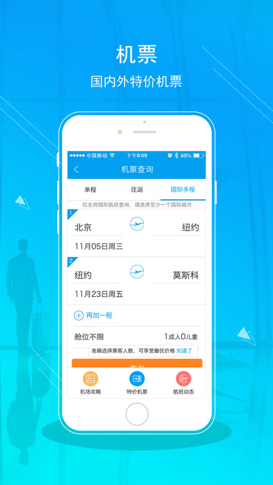 全球各航空公司的機票實時查詢和預訂,享受大幅度底價折扣基礎上的再優(yōu)惠;