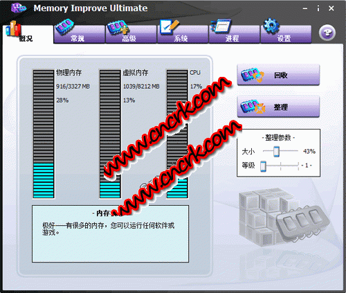 Memory Improve Ultimate V5.2.1.283 漢化純凈安裝版 WindowsCare是一款智能化和易于使用的優(yōu)化和監(jiān)控系統(tǒng)的軟件。他的界面很漂亮,它釋放和壓縮系統(tǒng)內(nèi)存,可以即時監(jiān)控內(nèi)存使用情況、頁面文件使用率和CPU使用率。使進程的運行速度和系統(tǒng)崩潰的幾率大大降低