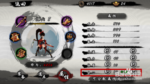 之后我們在右側(cè)可以看到屬性的信息,其中攻擊、防御、生命、暴擊屬性的增加,對應(yīng)的加點是力道、耐力、體質(zhì)、會心,我們加這些點即可提高相應(yīng)的屬性,如圖所示。