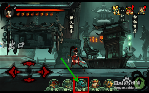如圖。打開游戲,進(jìn)入游戲主界面(秘境),之后點擊技能。