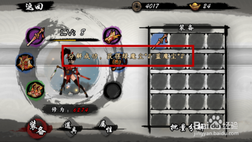 之后即可將裝備分解成功,并彈出分解成功的提示和獲得的獎勵,裝備就消失啦,如圖所示。
