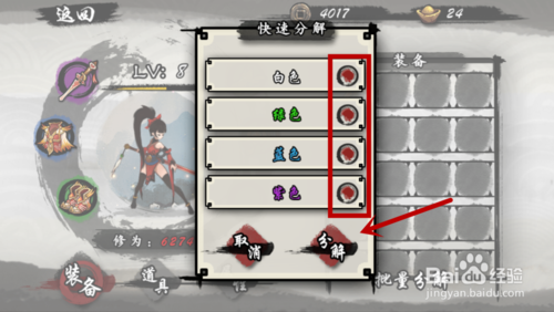 之后在彈出的選項中,選擇我們要分解裝備的品級,我們勾選那個品級的裝備,一次性就會全部將其分解。之后我們點擊下方的分解,即可分解裝備成功,如圖所示。