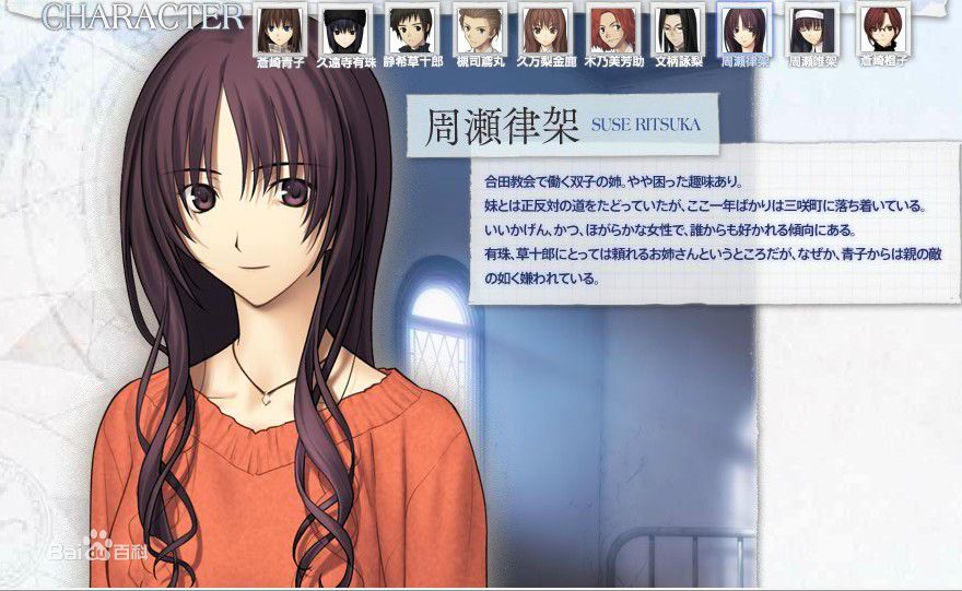 在合田教會(huì)工作的雙胞胎妹妹,患有先天性的弱視,已經(jīng)完全失明了。在鎮(zhèn)上是出了名的虔誠(chéng)的修女,性格有點(diǎn)認(rèn)真過(guò)頭。雖然是美人但貌似沒(méi)什么朋友。